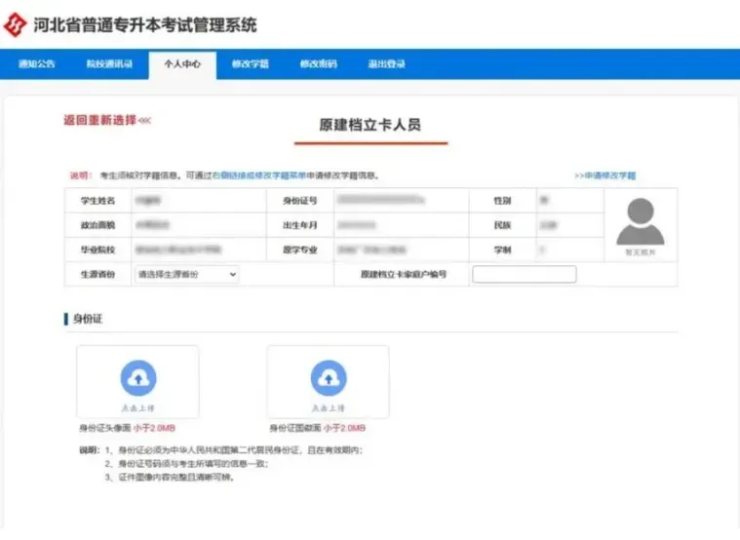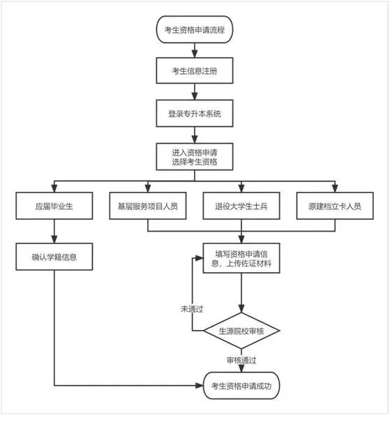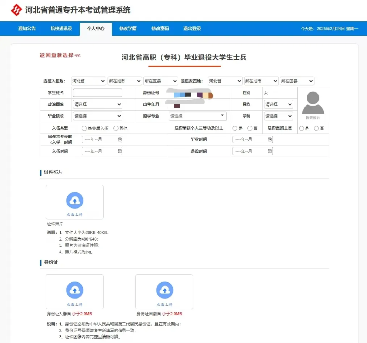 符合报考条件的退役大学生士兵考生,按系统要求填报相关信息,上传考生本人身份证、入伍批准书、退出现役证、毕业证书、教育部学历证书电子注册备案表(应届专科毕业生须上传教育部学籍在线验证报告)等佐证材料照片。