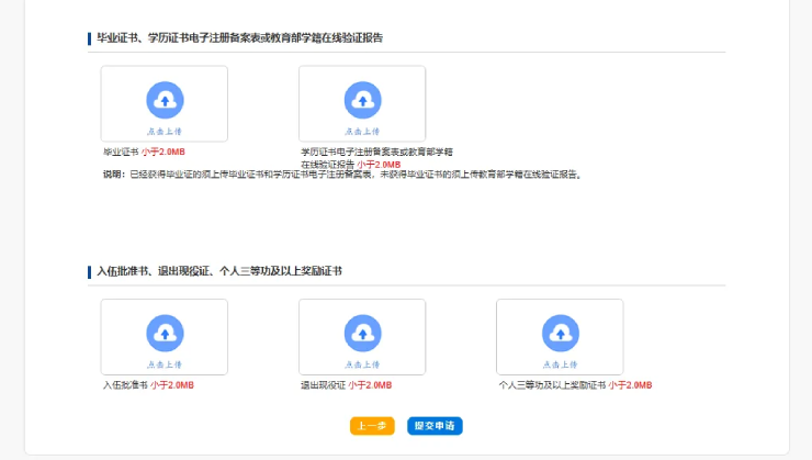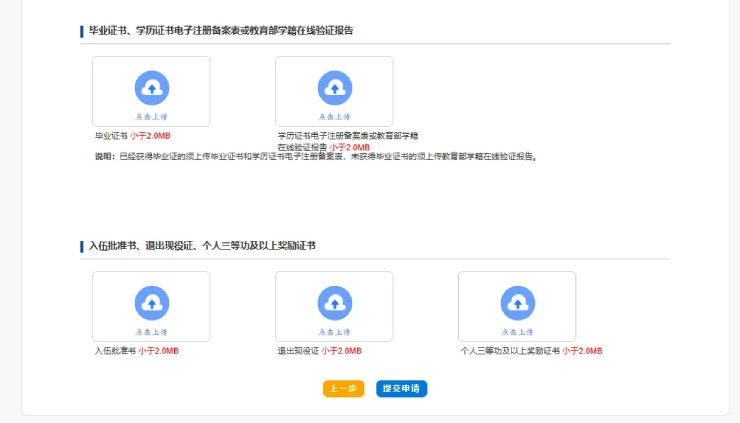 荣立个人三等功及以上奖励的退役大学生士兵,还须上传相关证书佐证材料照片,点击【提交申请】,等待审核。