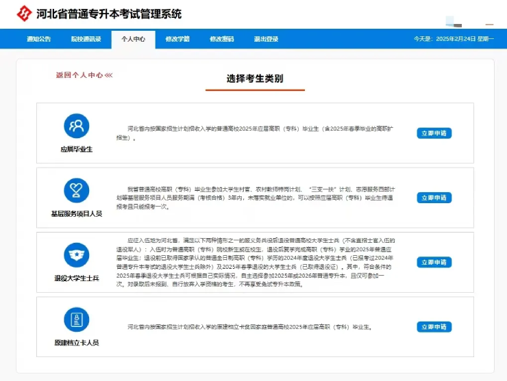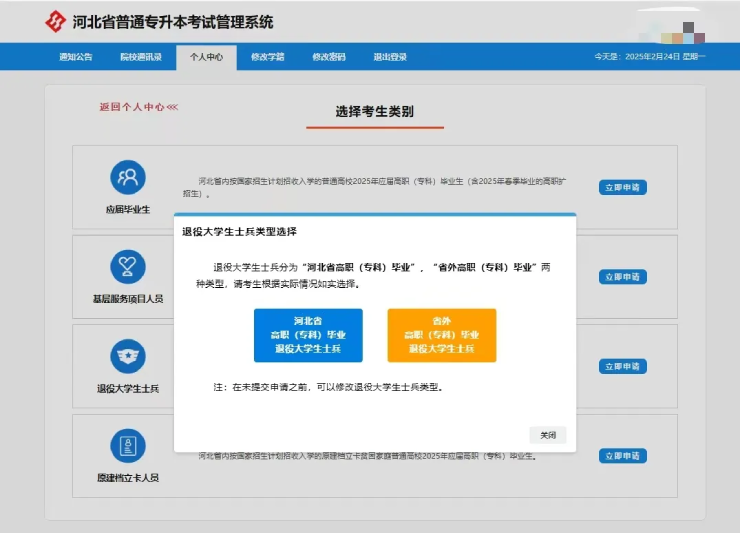 点击立即申请时会弹出:退役大学生士兵分为“河北省高职(专科)毕业”,“省外高职(专科)毕业”两种类型,请考生根据实际情况如实选择。