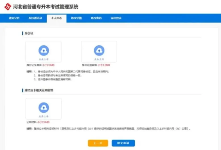 符合报考条件的原建档立卡贫困家庭考生,按系统要求填报相关信息,上传建档立卡相关证明材料〔县级及以上乡村振兴局(办)提供的证明或国扶系统查询界面截图并打印后加盖县级及以上乡村振兴局(办)公章〕照片,点击【提交申请】,等待审核。