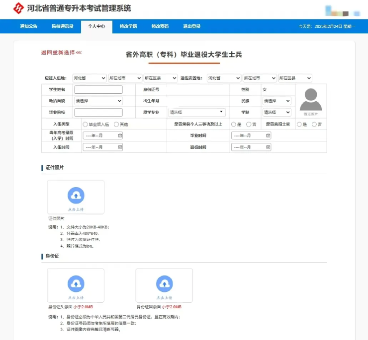 毕业于省外的退役士兵,除了上面要求的材料,还需要上传证件照。