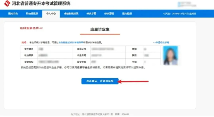 应届毕业生,只需要核对信息,信息正确,直接【点击确认,并退出系统】;若信息有误,则点击照片上面的【申请学籍修改】