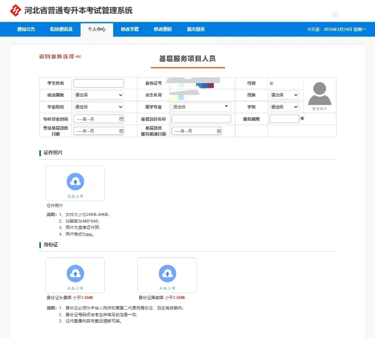 符合报考条件的基层服务项目人员,按系统要求填报相关信息,上传考生本人身份证、毕业证书、教育部学历证书电子注册备案表、相关基层项目服务期满合格证书等佐证材料照片,点击【提交申请】,等待审核。