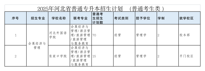 根据已公布的2025年河北专升本招生计划(普通考生类),现将会展经济与管理专业专升本招生院校、招生计划、考试类别、学制、授予学位、就读校区等整理如下,欢迎考生查阅、报考。